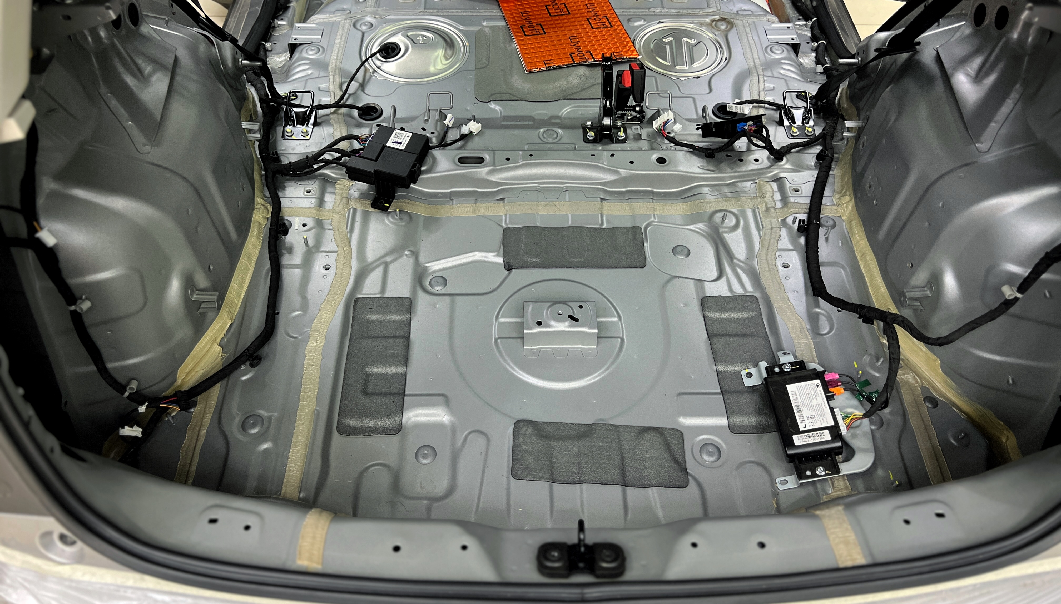 Обезжириваем поверхность и приступаем к монтажу второго слоя. Также для получения более эффективного результата используем компоновку из двух материалов На дно багажника клеим Шумофф Base 4. Этот слой позволит снизить нам шум от дороги.