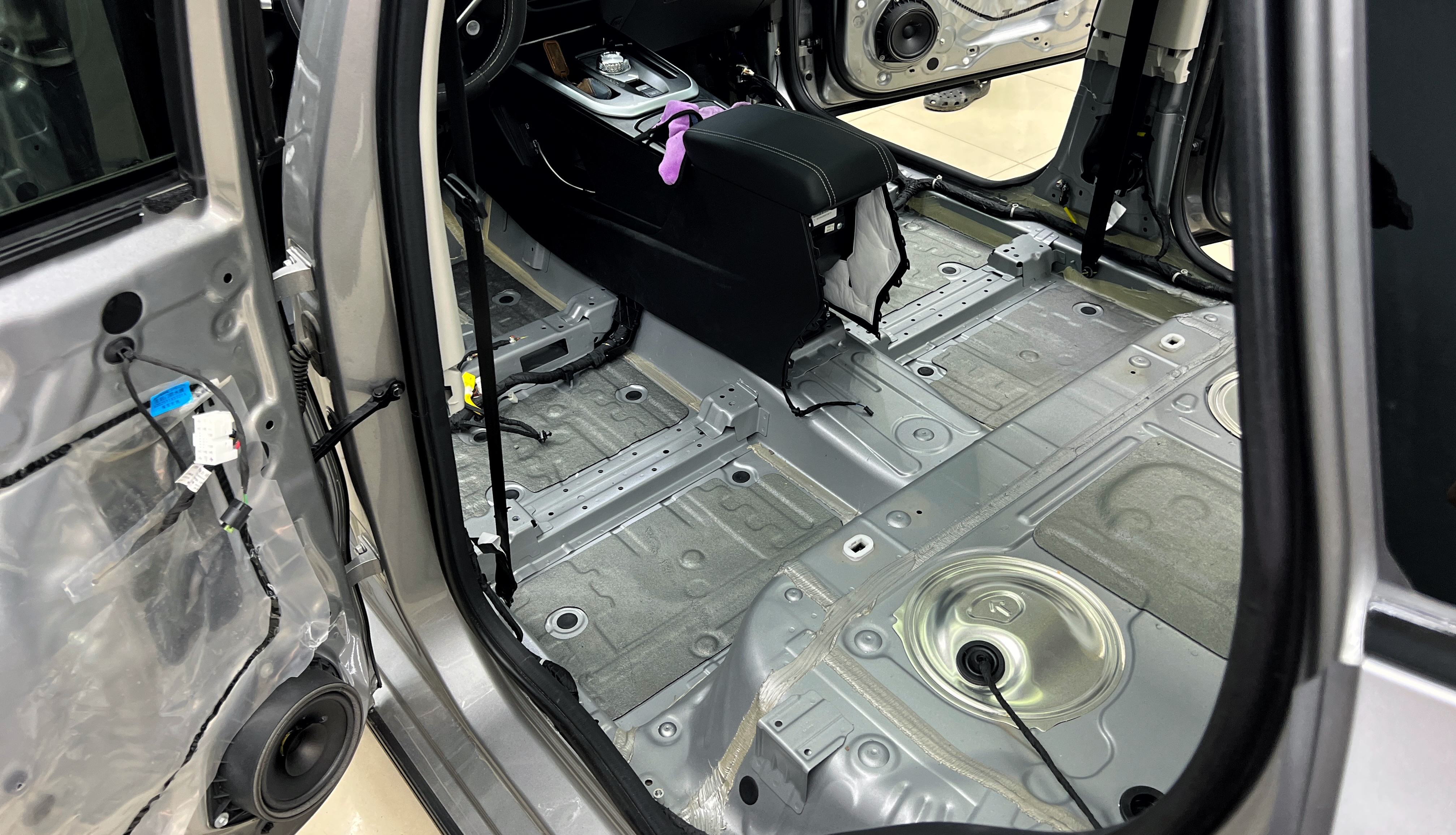 После разбора салона демонтируем ковер и вынимаем все элементы штатной шумоизоляции, а также воздуховоды.